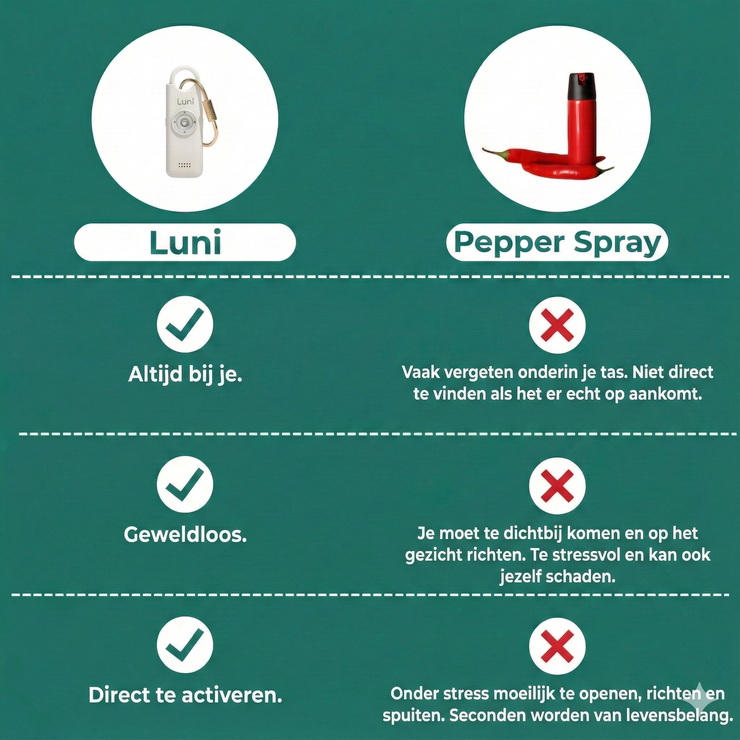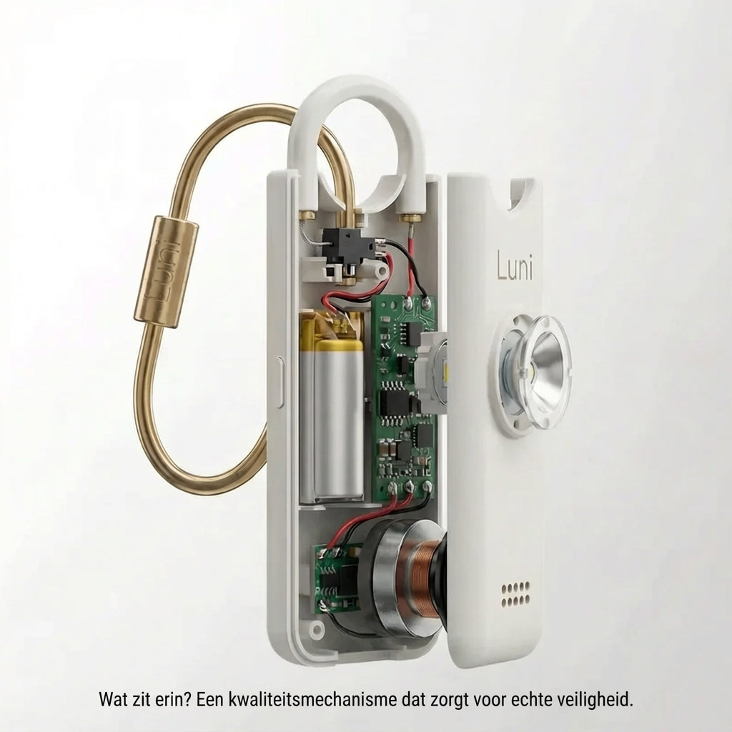 100%. In tegenstelling tot pepperspray (wat streng verboden is in Nederland), is Luni volkomen legaal om altijd en overal bij je te hebben. Omdat het een geluidsalarm is, mag je hem probleemloos meenemen door de douane op Schiphol, naar festivals, of in openbare gebouwen.