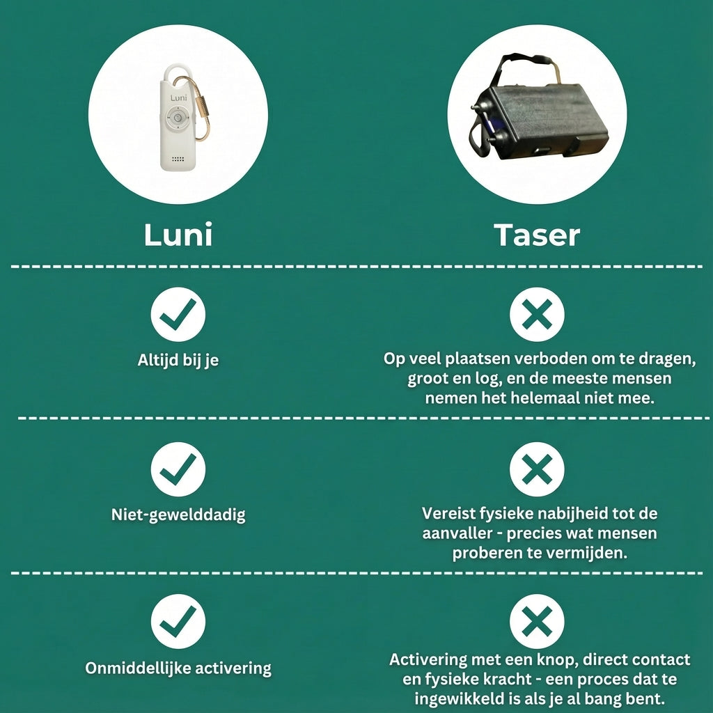 Daarom heb je Luni nodig. Luni is ontworpen om jóuw stem te zijn in die ene seconde dat je overrompeld wordt. Een oorverdovend alarm dat de stilte doorbreekt, zelfs wanneer de angst je verlamt.